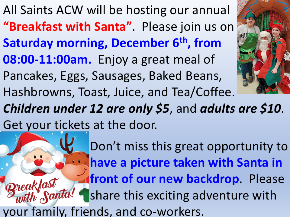The Christmas season is often hard on those whose hearts are hurting. All Saints Parish CBS will be holding its annual Blue Christmas Service on December 7th at 7:00pm. Please join with us as a Church in special recognition of those in our congregation who may be struggling with the loss of a loved one, or any other pain they may be carrying. As many of us tend to get caught up in the celebrations of the season, we sometimes forget those silently carrying a burden. Candles will be lit as a memorial to those we love but see no longer.
