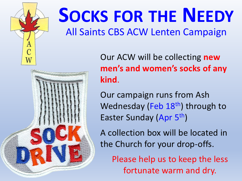 The CBS/Paradise Food Bank depends on your continued support to provide food to those in need. The following items are in great demand at this time: Sugar, Flour, Cake Mix, Cereal, Juices, Soup, Soup Mix, Spaghettios, and Kraft Dinner. If you wish to make a monetary donation, you may give as you are able, or simply email your donation to donations@allsaintsparish.ca. If you know of someone in need of assistance, they are to call the Food Bank at 834-2800.